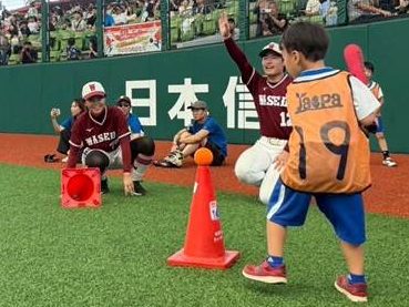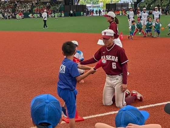 実際にどか点ゲームで審判として活躍した福永(スポーツ科学部 3年)は「1日を通して用事に憧れを持ってもらえるような振る舞いを心がけた。このプロジェクトがきっかけとなり、野球やソフトボールを始めてくれる人が増えてくれればこの取り組みが意味のあるものになるのかなと思う。そのためにも、私たちのようになりたいと思わせられるような活動を今後も続けていくことが大切だと感じた。また、他大学を巻き込んでのイベントは初めてであり、特に女性の活躍にも留意しながら幼児と接することで、新たな視点からこのイベントを楽しむことができた。」と語った。