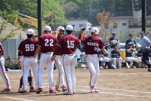 しかし4回表の攻撃を三者凡退に抑えると、その裏早稲田に流れが来る。先頭鳥岡が四球で出塁するとその後も織部の内野安打や相手の野選などで一死満塁の好機の場面で打席には石井。石井が期待応える特大満塁本塁打を放ち逆転に成功する。